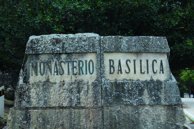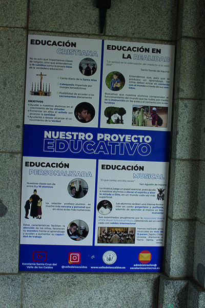 We lopen wat rond, op zoek naar een ingang van iets en informatieborden die je bij monumenten onder beheer van Patrimonio Nacional altijd tegenkomt. Hier dus niet. We vinden de achteringang naar een school met daarnaast een grote banner waarop staat dat de kinderen hier al zestig jaar worden onderwezen volgens de christelijke leer. We kijken elkaar met opgetrokken wenkbrauwen aan.