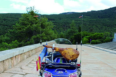 Buiten zien we hun motoren staan, ook daar zitten Spaanse vlaggetjes aangeknoopt en, wat we dan wel weer heel grappig vinden, één van hen heeft een Jamon Serrano op de bagagedrager gemonteerd. We zijn benieuwd of we hen weer tegen zullen komen bij ons bezoek aan het volgende punt op de route: een nationalistische bar in de wijk Usera in Madrid.